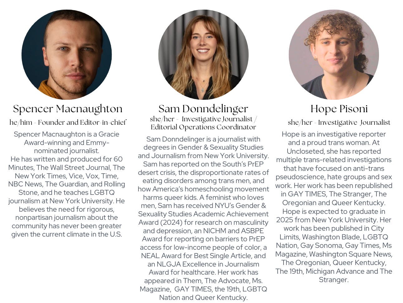 The publication was founded in 2024 by journalist/producer Spencer Macnaughton, who has worked at 60 Minutes and The Wall Street Journal and teaches LGBTQ journalism at NYU.