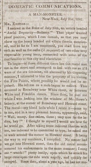 While a homosexual subculture is growing in New York City, the general public still refers to gay people as “sodomites,” as the word “homosexual” isn’t coined until 1868. Newspapers regularly publish articles calling out and expressing their disgust of suspected sodomites.