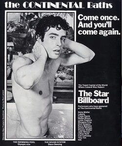 The Continental Baths opens in the basement of the Ansonia Hotel in New York City. Steve Ostrow, an icon of gay night life, transforms the dilapidated basement into a Roman-themed bathhouse, which eventually would include a disco room and a DJ booth. Continental Baths is one of many bathhouses thriving in the Post-Stonewall, Pre-AIDS years. The bathhouse combines sex, socializing and entertainment. It boasts an impressive list of attendees, including Andy Warhol, Mick Jagger and Alfred Hitchcock. The bathhouse would shut down in 1976.