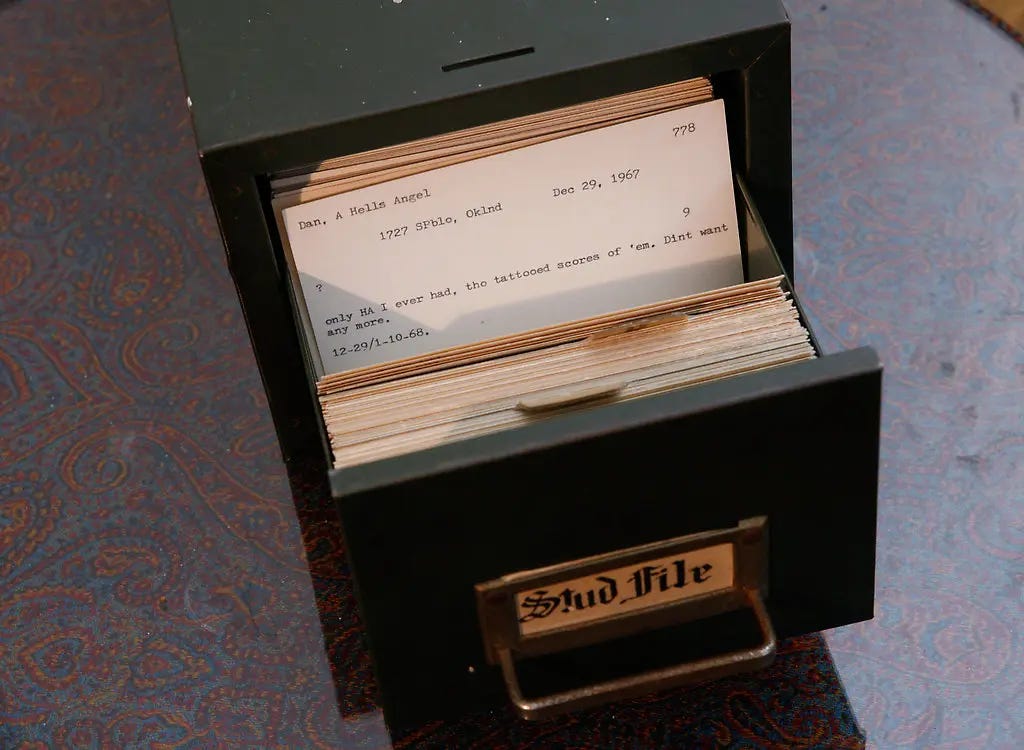 At the request of sexologist and biologist Alfred Kinsey, Samuel Steward documents his hookups in what he titles “Stud File.” The metal file box contains 746 index notecards—each one detailing a different hookup. The cards include partners’ physical details, meeting dates, sexual acts and a collection of donated pubic hair from 54 different men.