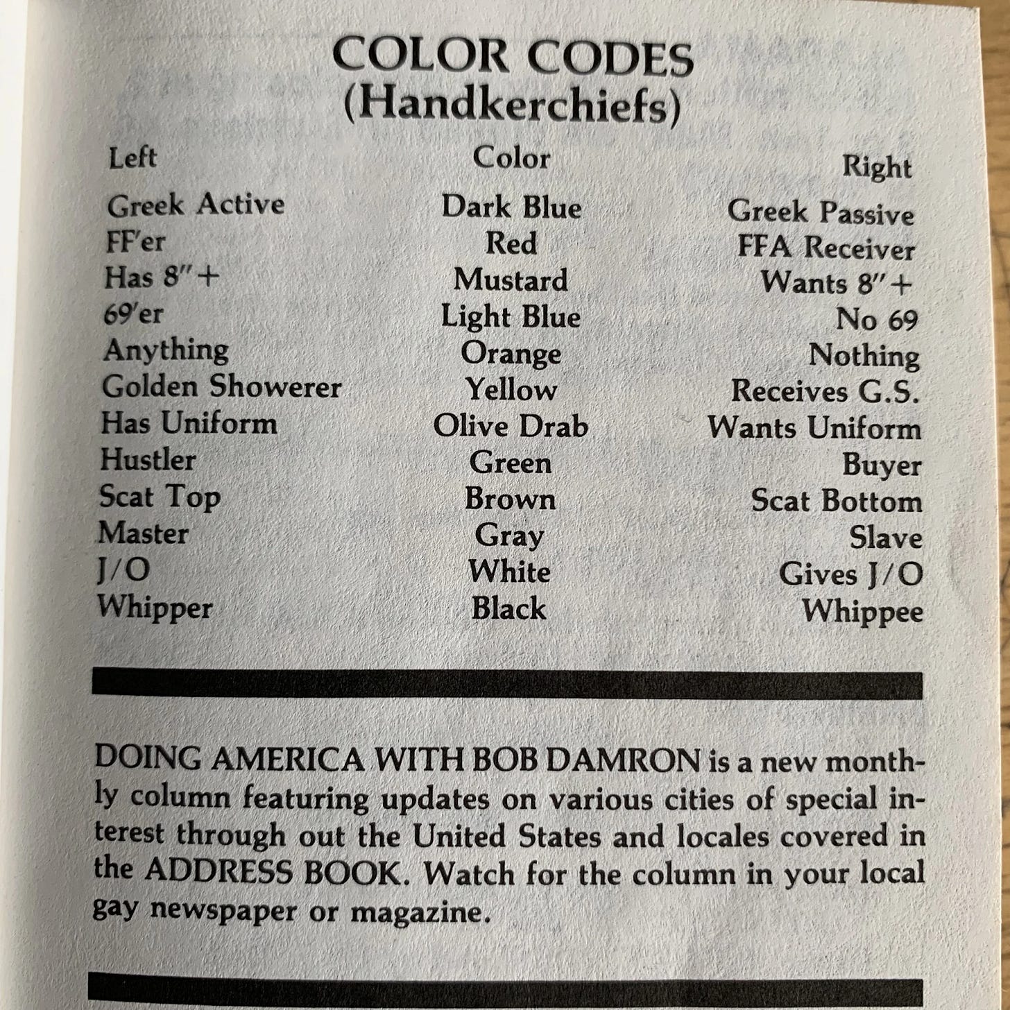 As years pass, the code takes on new life as a way to covertly signify sexual interests. In 1980, Bob Damron’s Address Book includes a section that details how a light blue handkerchief worn on the left means the individual wants a “69’er” and a mustard handkerchief worn on the right signifies “Wants 8″+.” This system helps revolutionize the cruising process by giving men the ability to nonverbally and discreetly communicate their sexual desires.