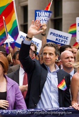Two days after signing the Marriage Equality Act, Cuomo marches in NYC Pride and is met with adoration and fanfare. He would continue to be a figure at NYC Pride for the next eight years, but since 2019 has no public record of attending.