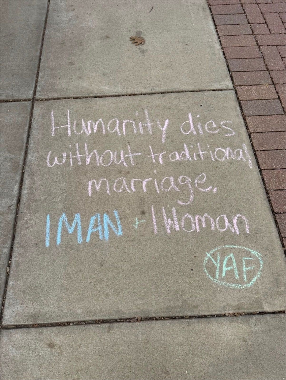 The YAF chapter at Oklahoma State University has gotten backlash for discriminatory rhetoric, including chalk art opposing gay marriage with statements like, “Humanity dies without traditional marriage, 1 man + 1 woman.”