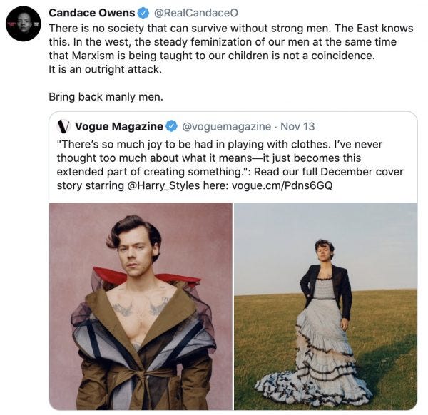 Owens attacks Harry Styles on X for wearing a dress on the cover of Vogue.