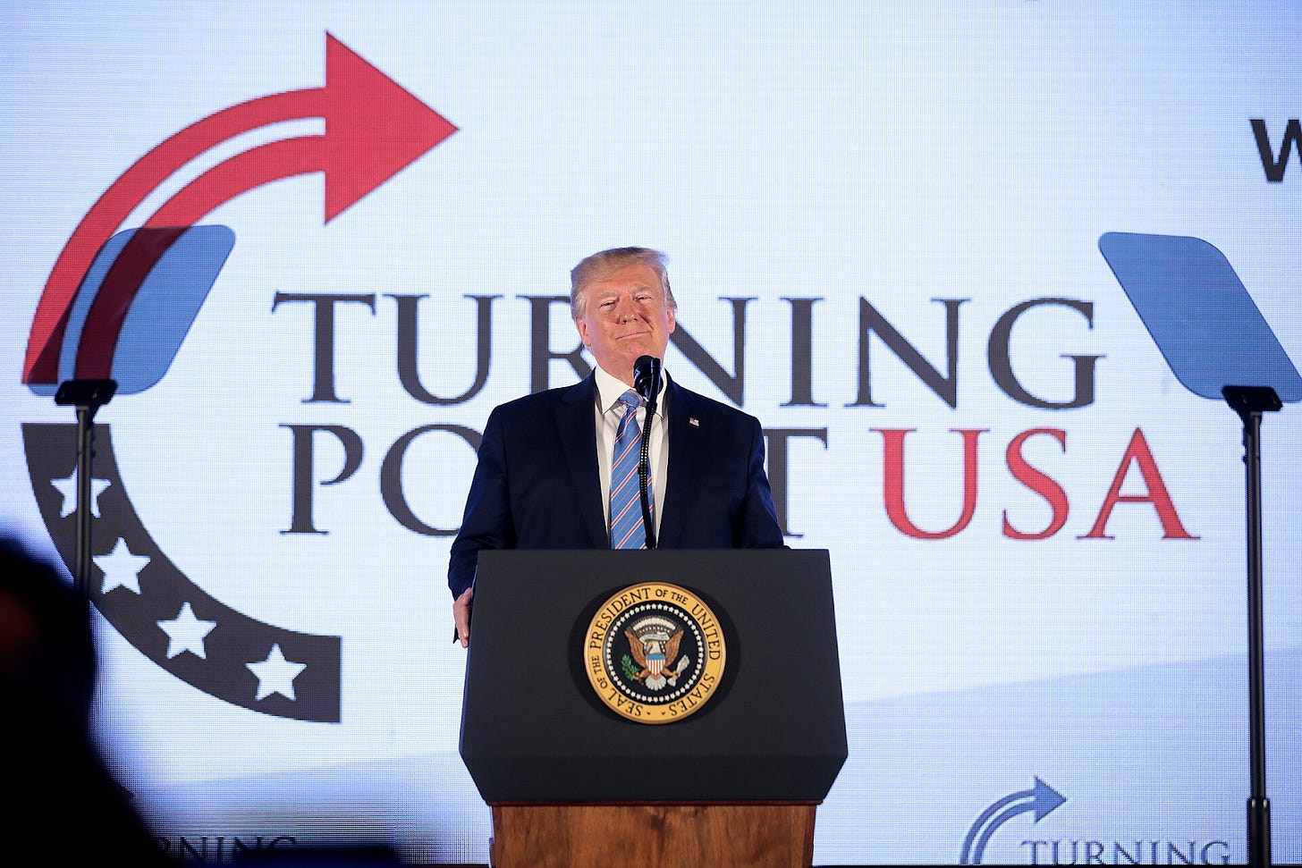 Trump appears at a TPUSA event, signaling collaboration with Kirk’s organization for his second presidential campaign, which was centered around anti-trans ads. Trump delegates many campaign responsibilities to Turning Point Action, the political advocacy arm of TPUSA. Trump tells the crowd, “Arizona is being turned into a dumping ground for the dungeons of the third world.”