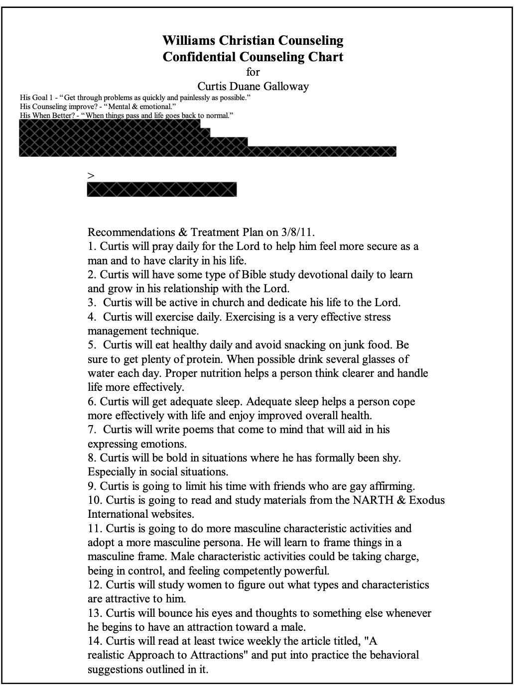He was given a treatment plan that involved limiting time with LGBTQ affirming friends, reading articles designed to redirect his attractions, and practicing what the therapist called “male characteristic activities,” such as taking charge and asserting control. He told his therapist that his marker of when things would be better was “life [going] back to normal.”