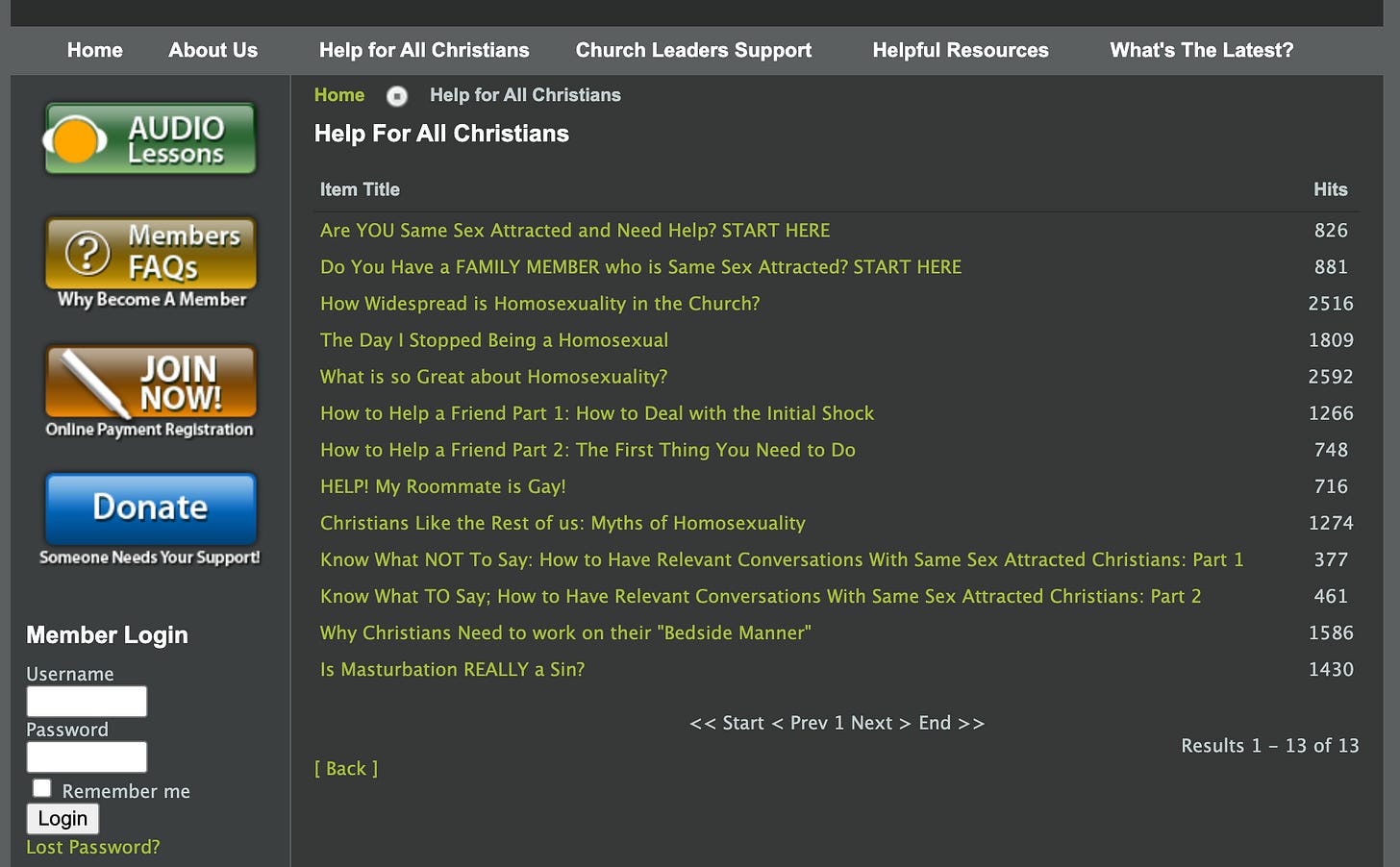 In a section called “Help For All Christians,” there were articles titled “Are YOU Same Sex Attracted and Need Help? START HERE” and “HELP! My Roommate is Gay!” I paid the $55 membership fee and got going.