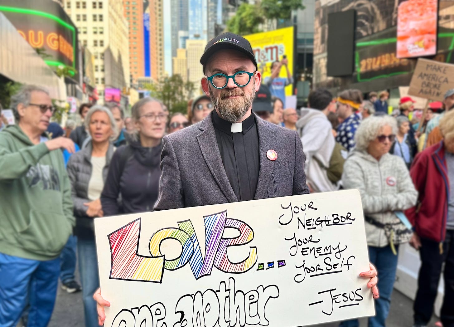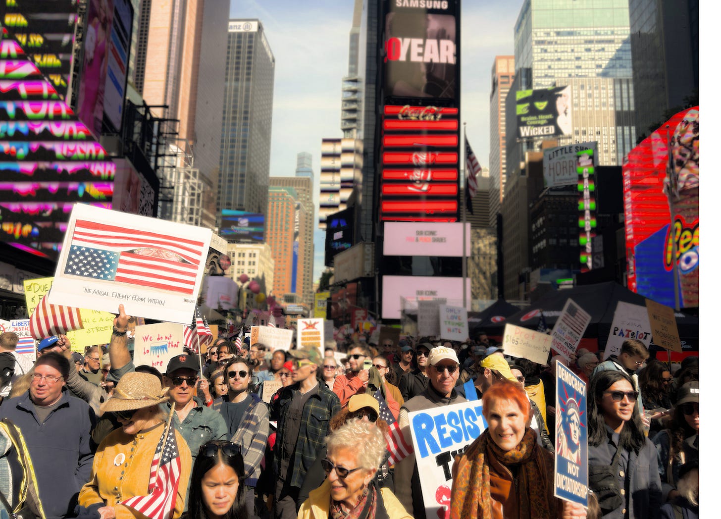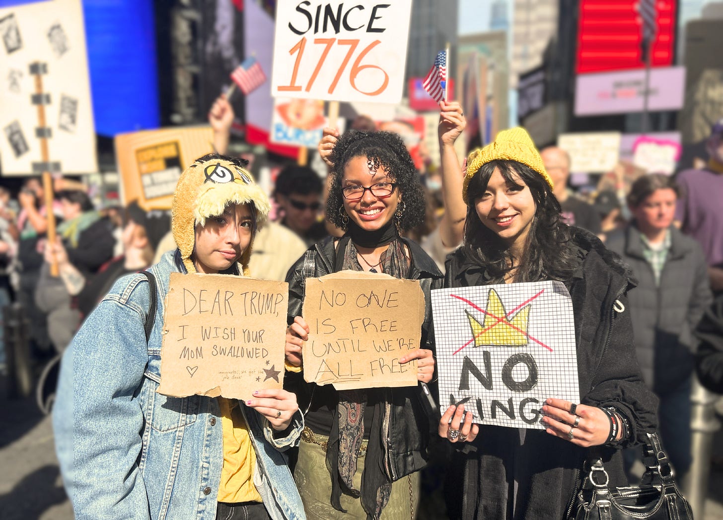 “Hey hey, ho ho, Donald Trump has got to go,” protestors chanted in the middle of Times Square, among a sea of signs that read “love reigns not kings,” “gays against faux-king Trump,” “we stand with … our trans family” and “the future is coming.”