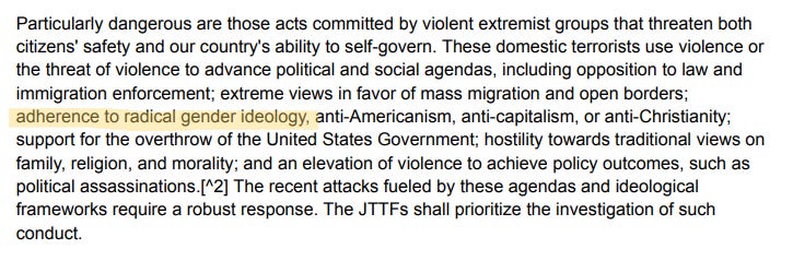 Shortly after, Trump released National Security Presidential Memorandum (NSPM)-7, which directs intelligence agencies to investigate left-wing political organizations for involvement in domestic terrorism, singling out “extremism on migration, race, and gender” and “hostility towards those who hold traditional American views on family, religion, and morality.”