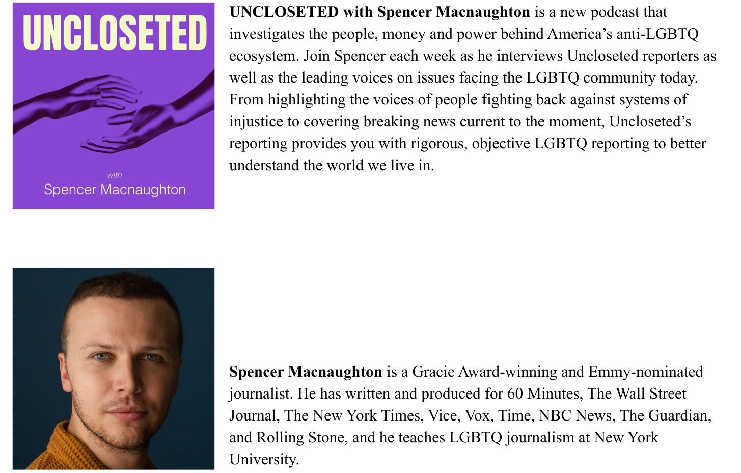UNCLOSETED with Spencer Macnaughton Dropping March 25 wherever you get your podcasts Starting March 25, the podcast will arrive in your inbox every Wednesday morning. Bonus clips will be uploaded to our YouTube channel. For all our podcast content: Subscribe to our YouTube Channel